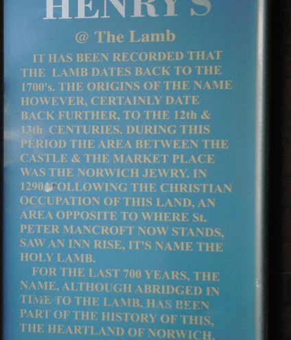 The first known Synagogue, dating approximately between 1087 and 1100 was in today’s Dove Street, then known as Holtor Lane. There is no trace of any such building today. Following this the Jews mainly settled in Norwich below the Castle in what is now the White Lion Street area of Norwich, so they were close to the Castle where the King’s representative lived. He had protection of the Jews and close to this is where the main medieval Synagogue was built. The site of the Synagogue was known to be approximately on the site of the old Lamb Inn and the present store, Primark. In the 1960s when buildings on the Primark site were demolished to make way for a new store, then Littlewoods, remains were found of glazed tiles and parts of pillars which were dated to the period of the 12th or 13th century. The synagogue was destroyed either by fire in 1286 or by demolition in 1290, when the Jews were expelled from England. There was a plaque in the Lamb Inn passage for many years to record the site of the mediaeval Synagogue. (see photo). However, in recent times this was removed by the owners of the pub, and to date has not been replaced.