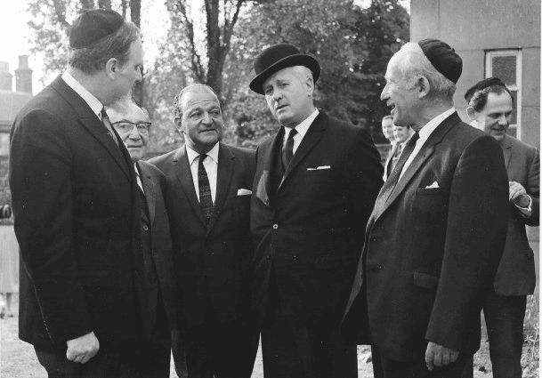 In 1948, after 6 years of temporary accommodation at the Spiritualist Church, the City Council leased to the community the present site on Earlham Road, on which a pre-fabricated Synagogue was initially erected, with an undertaking to build a permanent Synagogue within 10 years. This period had to be very much extended and our present building was not built until 1968/9. The Communal Hall with a flat above to house a Minister, was built in 1951. The photograph above shows the opening of the communal hall by the Chief Rabbi, Dr Israel Brodie, with the temporary Synagogue in the background.